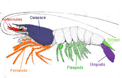 The body of a decapod contains nineteen segments, which may contain a pair of appendages, and can be divided into two main divisions: the cephalothorax (head and thorax/pereon) and the pleon (abdomen). The following is a breakdown of these features (listed from anterior to posterior).