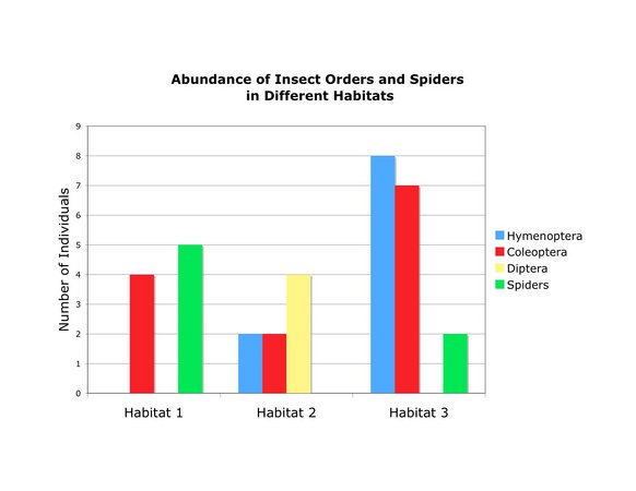 If you find orders of arthropods in your trap that are not on the data sheet, you may simply add them at the bottom of the list. After you have finished sorting all your traps, you will tally the numbers from each trap and order to be entered into the abundance and diversity data sheets. From these tables you should construct bar charts that show the differences in the abundance and diversity of your habitats. Examine the bar chart below that was created with imaginary data. This is an example of the type of chart you might construct with real data.